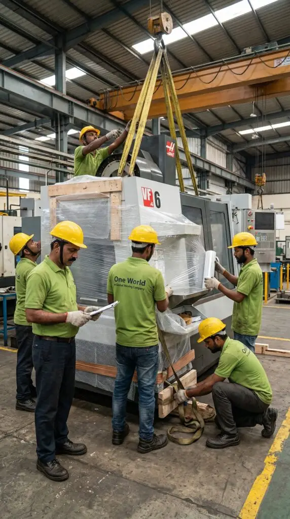We use custom wooden crating, anti-vibration padding, hydraulic lifters and trained rigging engineers. Every machine is inspected before and after shifting with a zero damage guarantee.